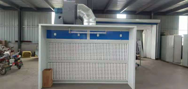 干式噴漆柜主要是把噴工件時多余的漆霧經過風機吸力排出室外,噴漆作業(yè)時利用風機的吸力 ,把噴向工件上多余的漆霧通過過濾紙,過濾棉二次凈化后,經漆氣分離裝置,進入活性炭過濾層過濾,將凈化后的氣體排出室外。廢漆去除達到80以上。漆霧與氣混合隨風,經過濾紙,過濾棉過濾,油漆殘渣浮在上面,揮發(fā)性氣體亦經過活性炭過濾,從而保持排出室外的氣體清潔,從而完成漆霧凈化目的。