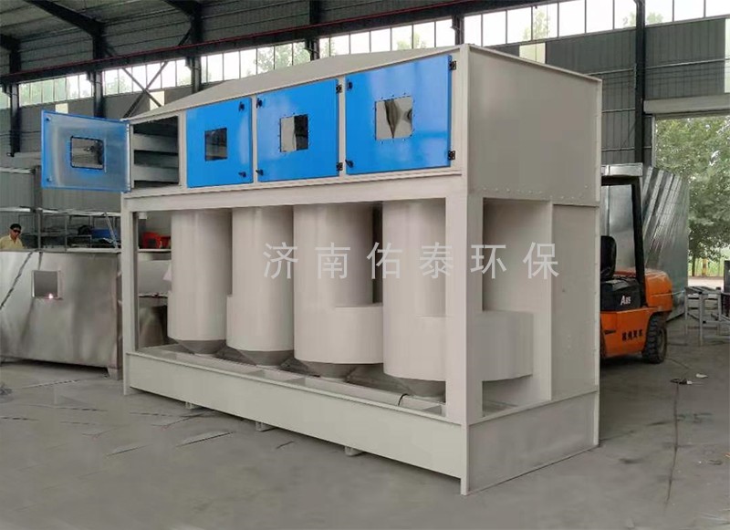 2、氣旋噴漆柜,移動(dòng)伸縮房固定端設(shè)置一臺(tái)6米長(zhǎng)氣旋噴漆柜,噴漆產(chǎn)生的漆霧顆粒,在風(fēng)機(jī)的遷引下,一部分漆霧顆粒吸附在水簾上面并落入水池中。絕大部分漆霧顆粒經(jīng)過(guò)氣旋裝置及漆霧分離裝置的碰撞,***后也落入水池之中。漆霧去除率達(dá)到95%以上。從頁(yè)排出不含漆霧顆粒的有機(jī)廢氣。為后續(xù)催化燃燒設(shè)備的正常運(yùn)行,提供良好的預(yù)處理?xiàng)l件。