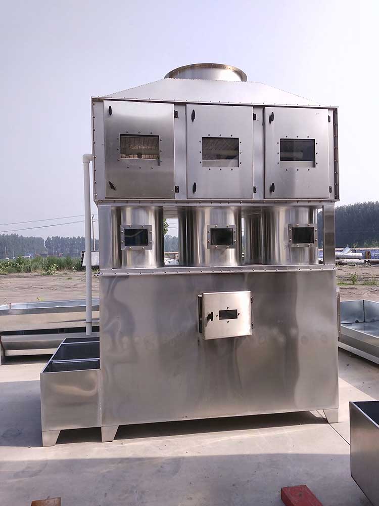 一、旋流脫硫塔工作時(shí)含塵廢氣由風(fēng)管引入旋流塔內(nèi),經(jīng)過(guò)旋轉(zhuǎn)洗滌桶風(fēng)帶加快,帶動(dòng)填料球飛帶運(yùn)轉(zhuǎn),在洗滌桶里,含塵廢氣與水霧充分混合洗滌、中和反應(yīng)(水里面補(bǔ)充有酸堿時(shí)),廢氣經(jīng)過(guò)凈化后,再經(jīng)除霧層脫水除霧后由風(fēng)機(jī)排入大氣或再進(jìn)入其他凈化設(shè)備(光氧催化設(shè)備、活性炭吸附箱催化燃燒裝置等),吸收液在塔底經(jīng)水泵增壓后在箱頂噴淋霧化而下,回流至箱底循環(huán)使用。
