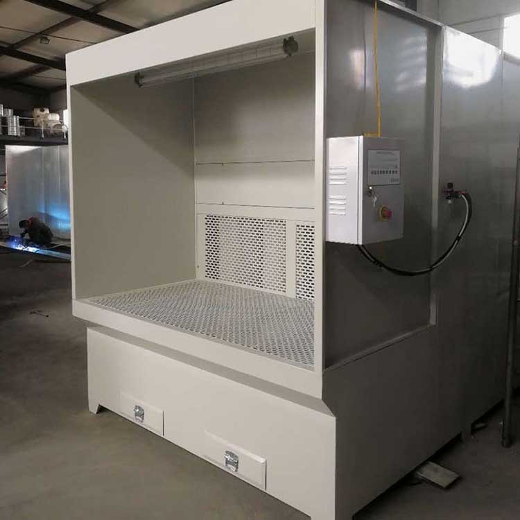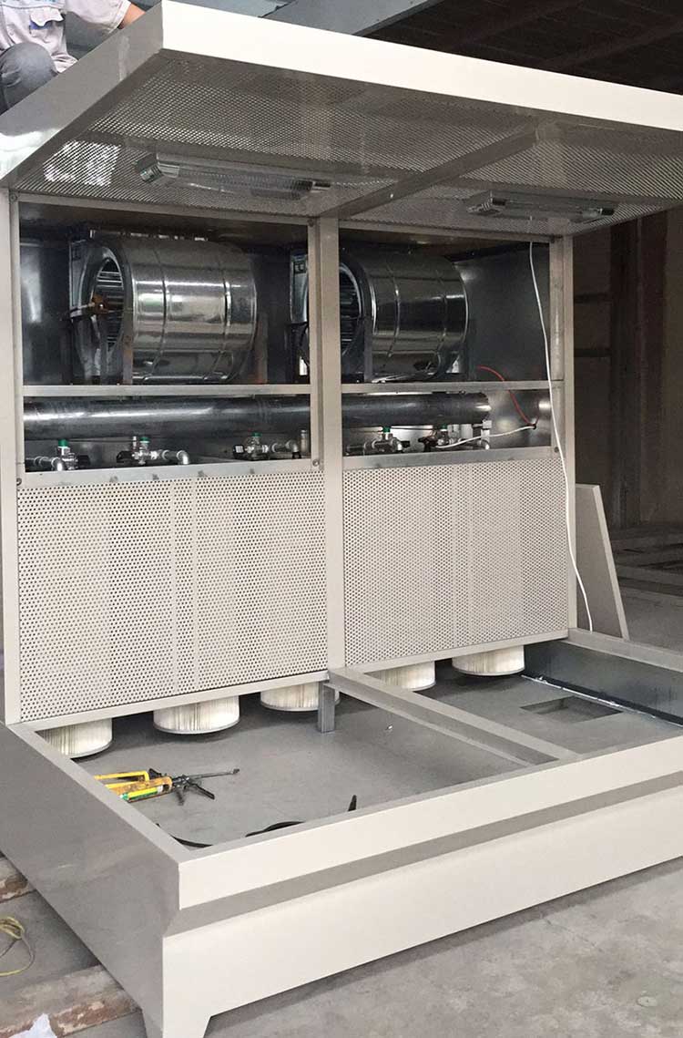 多工位打磨吸塵工作臺(tái)工作時(shí),把工件放在工作臺(tái)面上打磨,在排風(fēng)機(jī)的抽吸作用下,將工件上打磨出來(lái)的粉塵、灰塵等物吸入機(jī)內(nèi),打磨出來(lái)的粉塵不會(huì)在操作者的呼吸處停留,而隨抽風(fēng)的氣流迅速抽進(jìn)主機(jī)里,帶有粉塵的氣流通過(guò)百味窗透過(guò)濾芯排風(fēng)過(guò)濾系統(tǒng)流向機(jī)外,粉塵顆粒經(jīng)過(guò)濾芯過(guò)濾后掉下主機(jī)的集成箱里,干凈的空氣排出。還有一部分氣體通過(guò)回風(fēng)道經(jīng)過(guò)風(fēng)口棉,再次過(guò)濾吹到工作臺(tái)面,從而達(dá)到循環(huán)的***佳效果。這樣大大改善了工作環(huán)境。