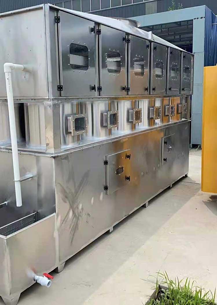 方形旋流凈化塔對(duì)有機(jī)廢氣的治理是基于原有圓形噴淋塔的原理,自主研發(fā)的噴淋凈化效果更為高效的噴淋塔預(yù)處理設(shè)備。該設(shè)備能有效去除氯化氫氣體(HCl)、氟化氫氣體(HF)、氨氣(NH3)、硫酸霧(H2SO4)、鉻酸霧(CrO3)、氰氫酸氣體(HCN)、堿蒸氣(NaOH)、硫化氫氣體(H2S)、福爾馬林(HCHO)等水溶性氣體。旋流板塔