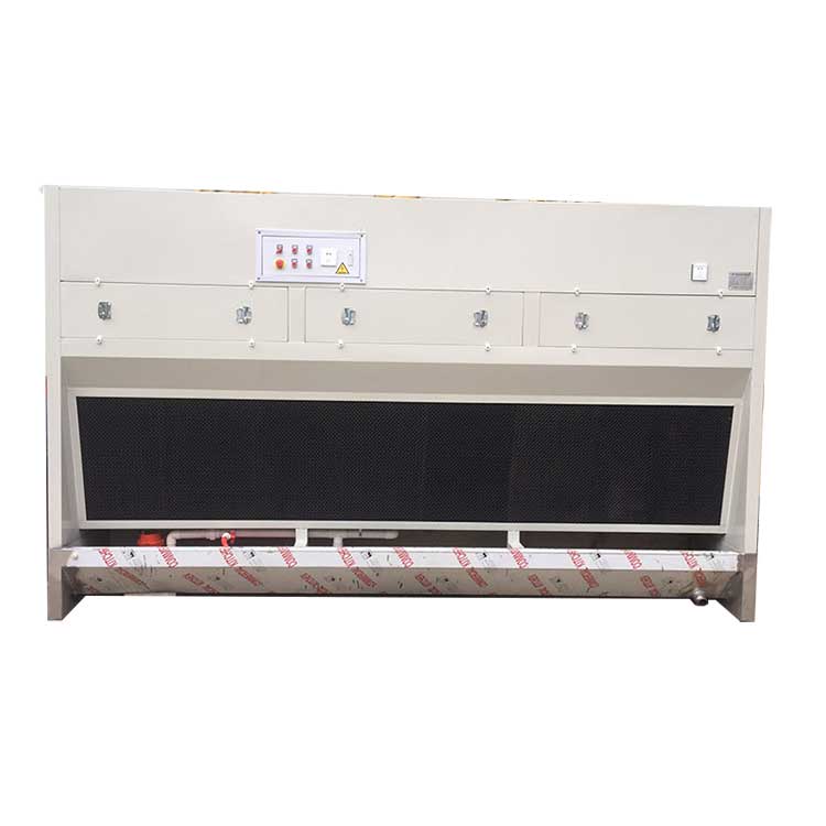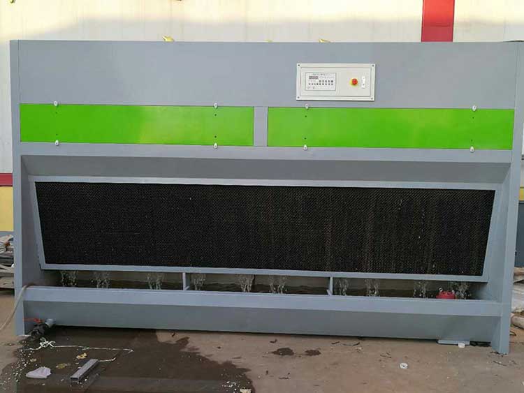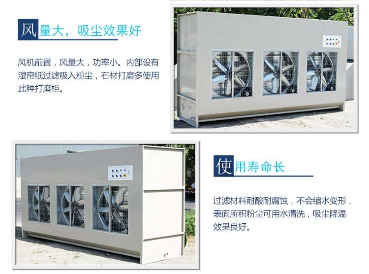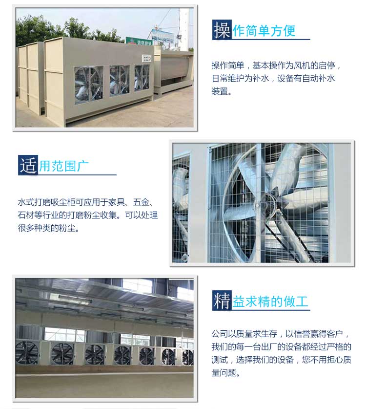 3、工作原理:產品打磨產生的粉塵,經過風機,吸附到打磨柜里面,通過里面的水循環(huán),落到打磨柜的下面。